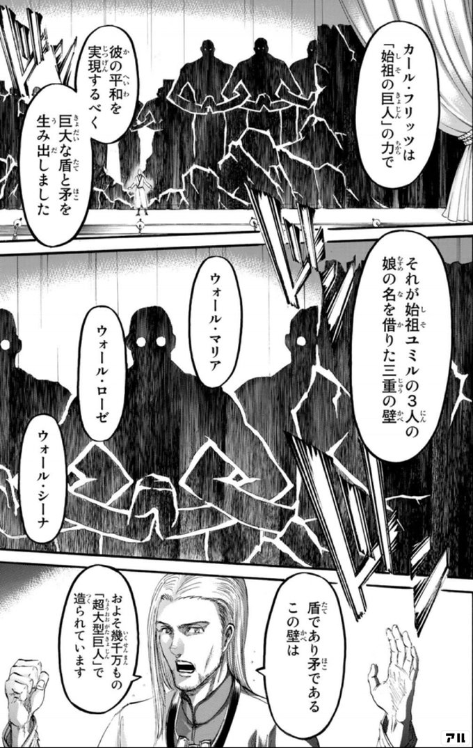 カール フリッツは 始祖の巨人 の力で 彼の平和を実現するべく 巨大な盾と矛を生み出しました それが始祖ユミルの3人の娘の名を借りた三重の壁 ウォール マリア ウォール ローゼ ウォール シーナ 盾であり矛である この壁はおよそ幾千万もの 超大型巨人 で造られ